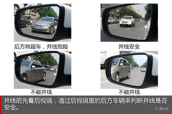 并线前先看后视镜,后视镜里的后方车辆完整或至少有一大半的时候,可以安全并线,并且一定要提前要打转向灯。